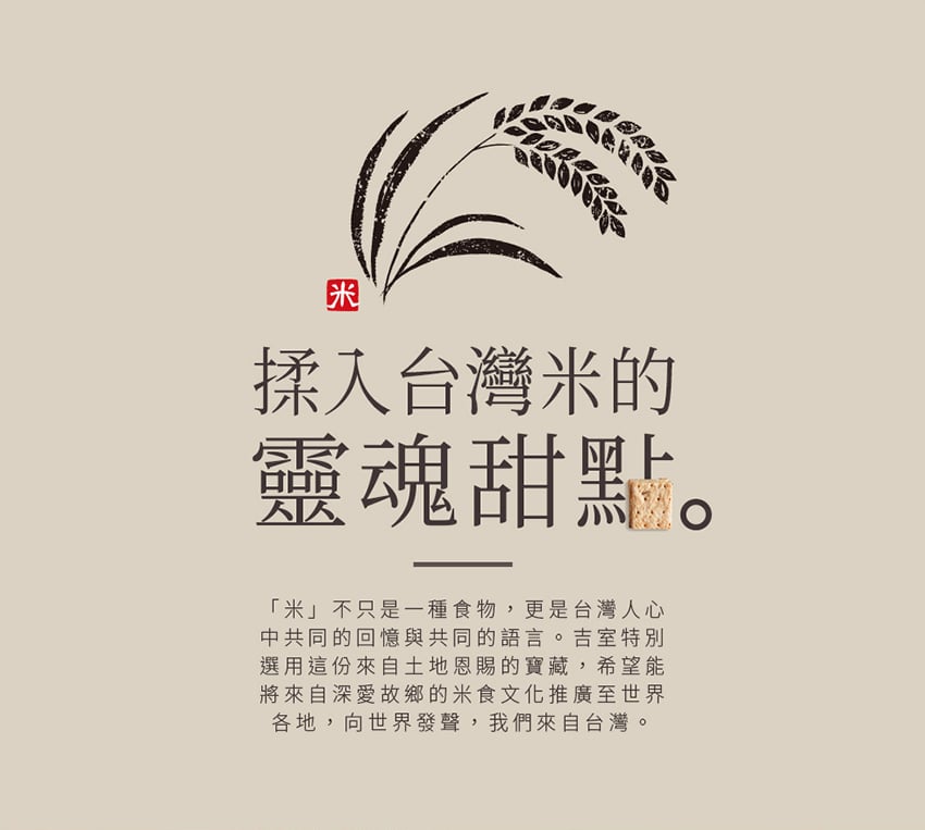 「米」不只是一種食物,更是台灣人心中共同的回憶與共同的語言。吉室特別選用這份來自土地恩賜的寶藏,希望能將來自深愛故鄉的米食文化推廣至世界各地,向世界發聲,我們來自台灣。