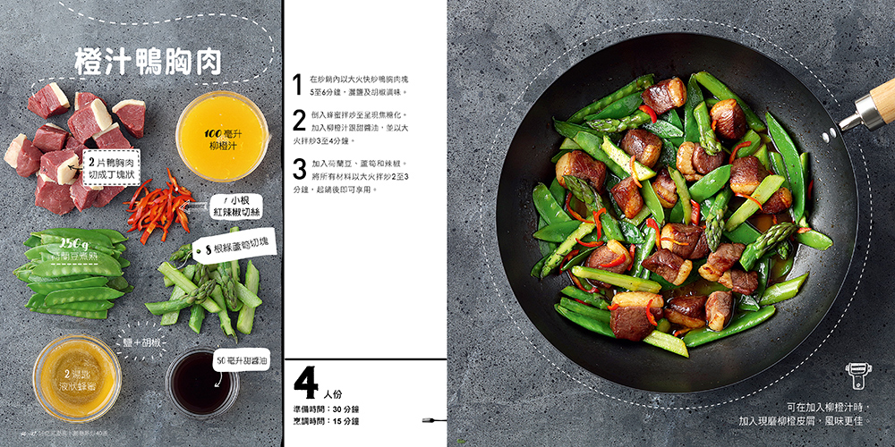 只要一點小小的嘗試與改變,就能讓日常煮食充滿驚喜。青蔥炒牛肉加點蜂蜜和檸檬汁提味,激盪出意想不到的味蕾體驗;炒鴨胸肉加點柳橙汁增添香氣,風味令人難忘!