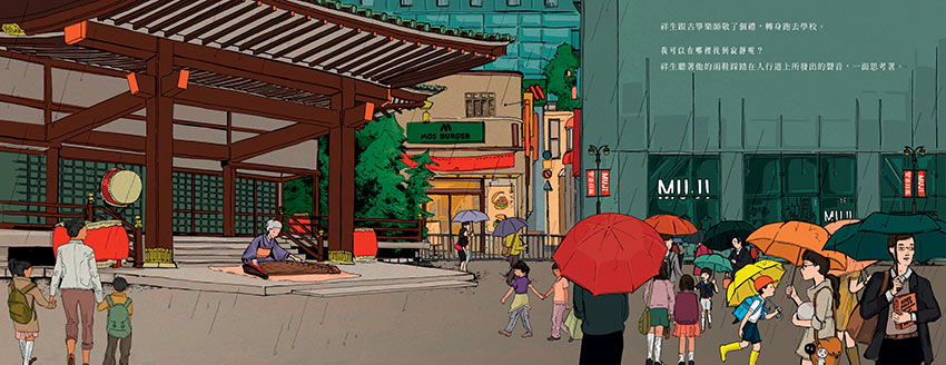 祥生走出家門,整座城市的聲音在他耳邊迴響。雨鞋踩過水面,發出的啪嗒聲;風吹過竹林發出窸窸窣窣的聲響;還有古箏時而高亢、時而低沉的樂音,每個聲音都有其趣味。然而,這些都不是樂師說的最美之聲──寂靜。