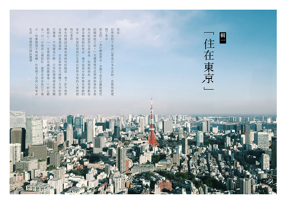 因為喜歡日本現代建築而前往日本工作、生活,以東京為據點,在日本各處以建築為主題展開旅行,喜歡在地圖上將想看的建築標上星號,並以影像與文字記錄,或是上傳至網路上與大家分享。