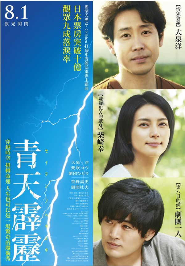 《青天霹靂》根據日本知名搞笑藝人劇團一人創作小說改編,他同時身兼導演、主角及編劇,同時找來大泉洋與柴崎幸共同主演,打造笑淚交織的日本年度感動之作。《青天霹靂》日本首周上映便創近兩億元日幣佳績,觀眾超過九成爆棚熱淚好評。電影主題曲由日本搖滾天團Mr. Children打造,發行首日立刻勇奪五大排行榜冠軍,被看好將成為日本年度歌曲。
