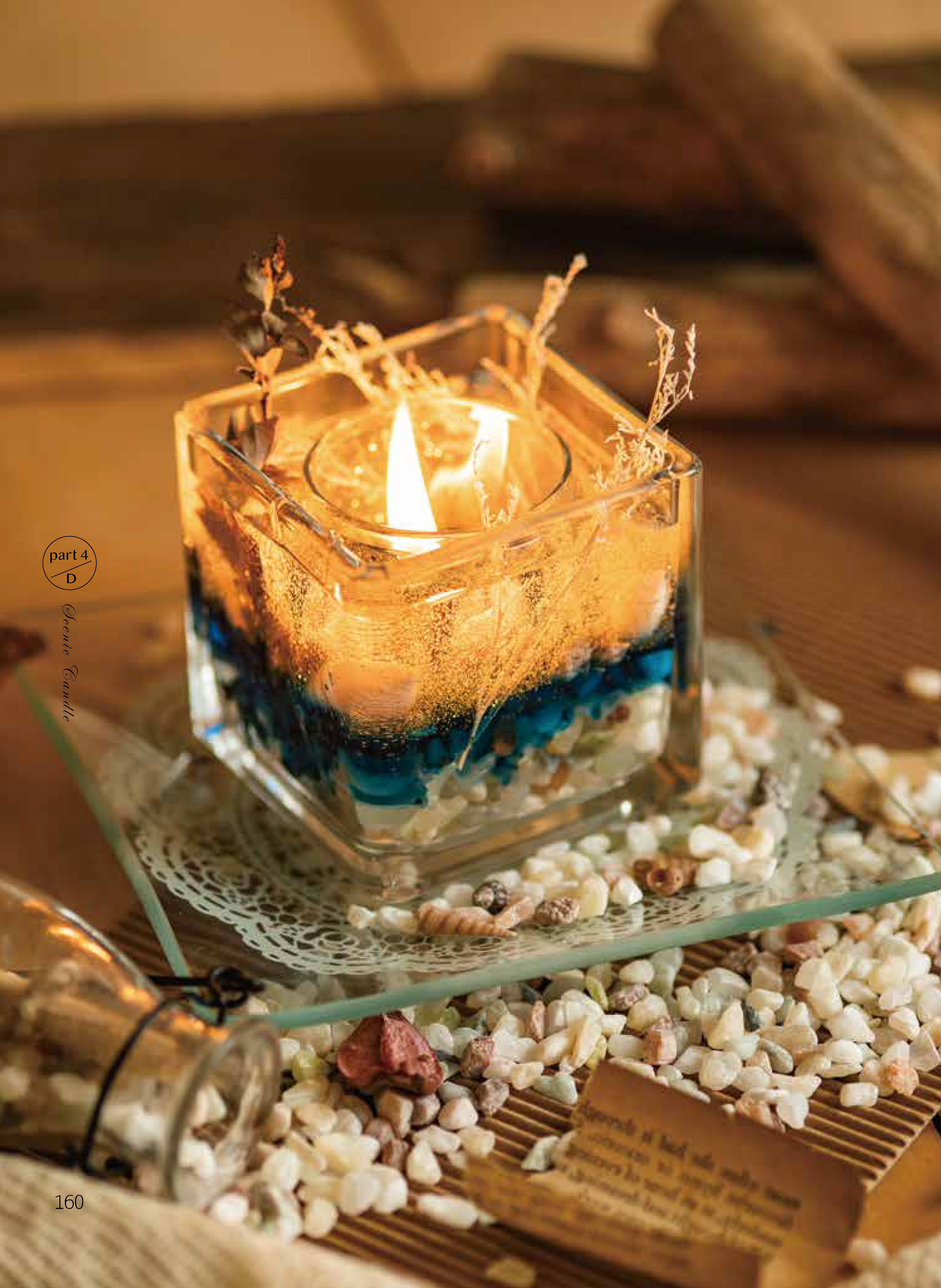 依據學生詢問度最高的20種蠟燭,將較常見的五大蠟材種類分為「天然純淨」、「創意透光」、「質感花紋」、「精緻心意」等單元主題呈現,包含延伸作法可變化出數十種宛如藝術品般的蠟燭創作。