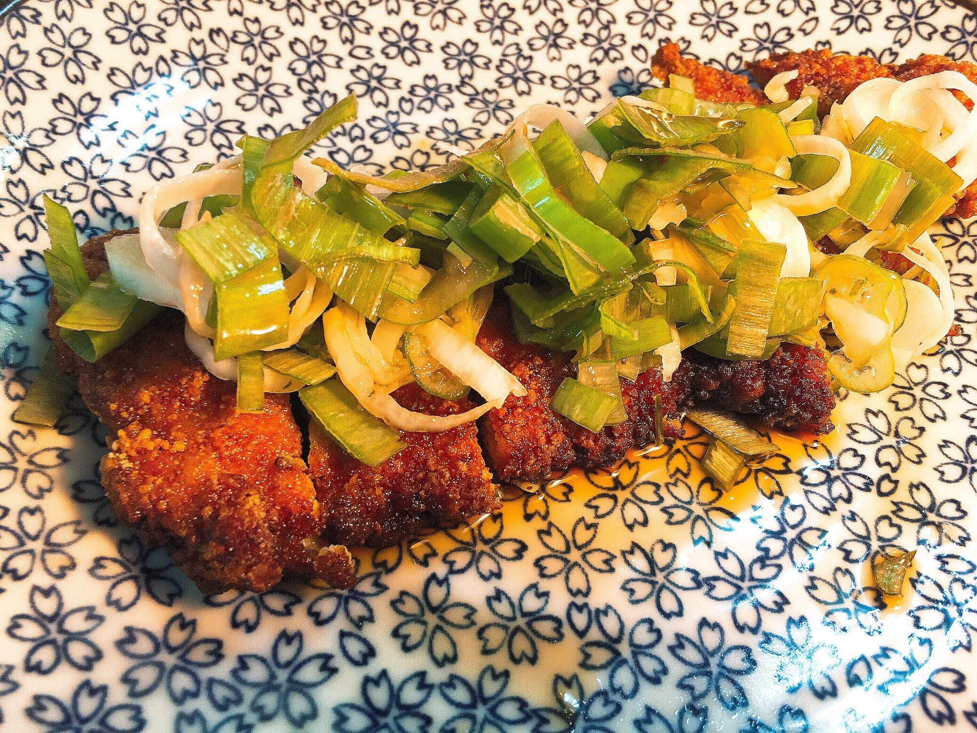 其實故事開頭已明列做法:豬肉裹麵衣下鍋炸,加上很多大蔥然後淋上酸桔醬。小編還讀到了一個關鍵字:排骨麵的排骨。所以,並非豬排丼那種裹蛋液加麵包粉外皮酥脆的豬排。然後其實買小吃攤的豬排(請買裹粉的)回來弄也可以,不方便炸東西的常客歡迎參考這做法。