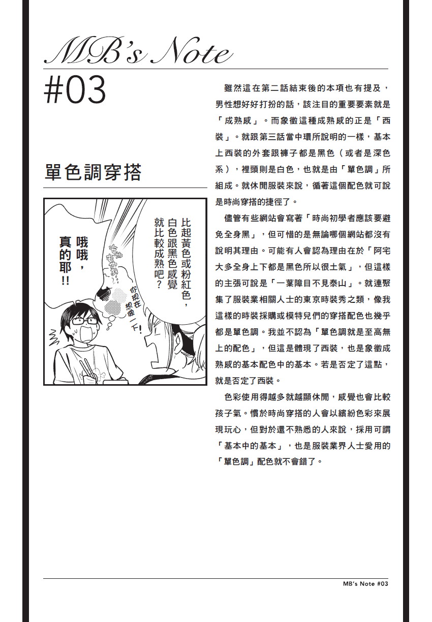 具有「時尚教科書」之稱的男裝採購專家MB,透過漫畫家縞野やえ筆下每一位活靈活現的人物,用淺顯易懂的方式,說明各種穿搭理論及技巧!第一集當中介紹了幾個男裝時尚穿搭的要點,像是色調的運用、如何製造出掩飾體型的視覺效果,還有幾種百搭單品等等,只要將穿搭邏輯融會貫通,任誰都能穿得時尚穿得潮!