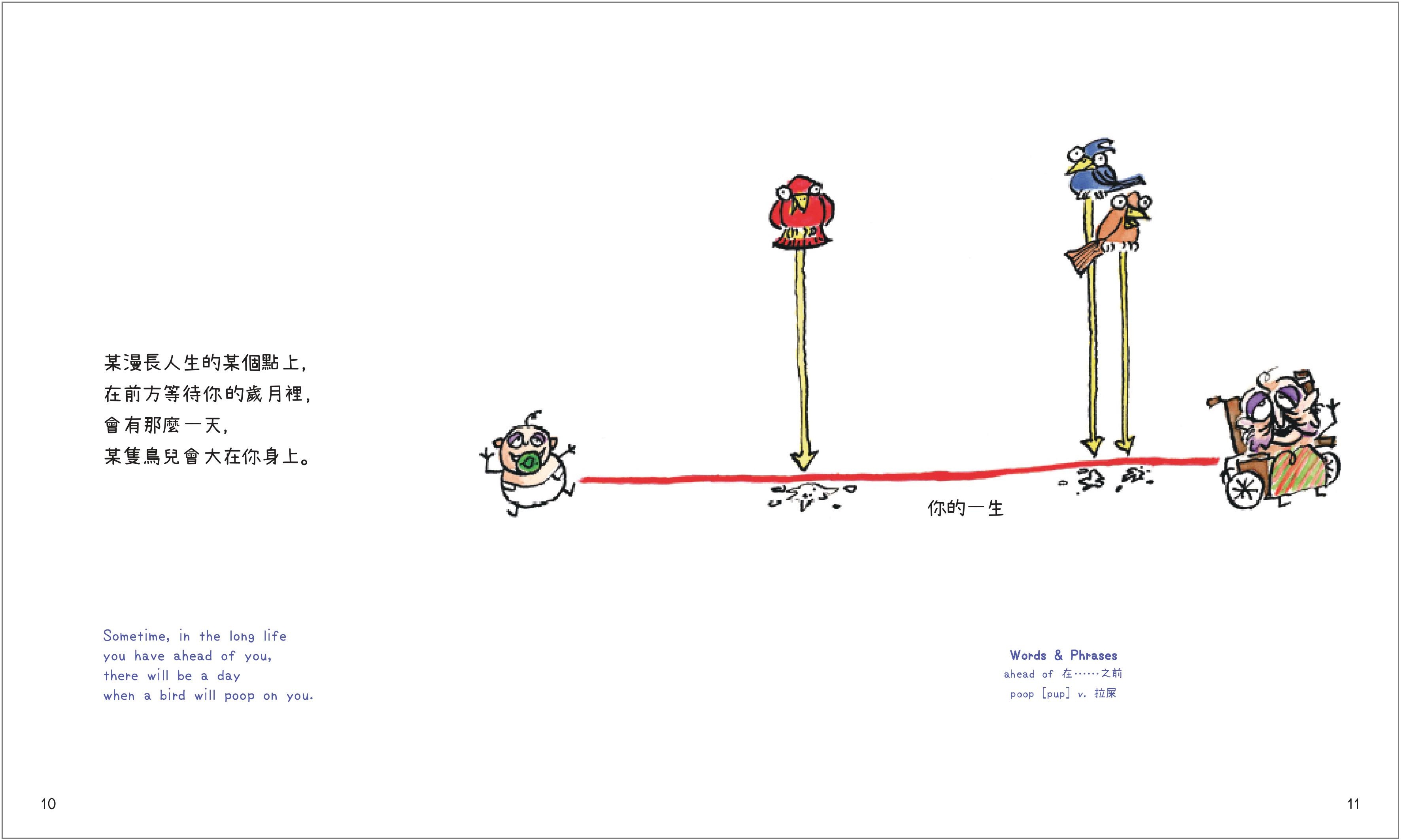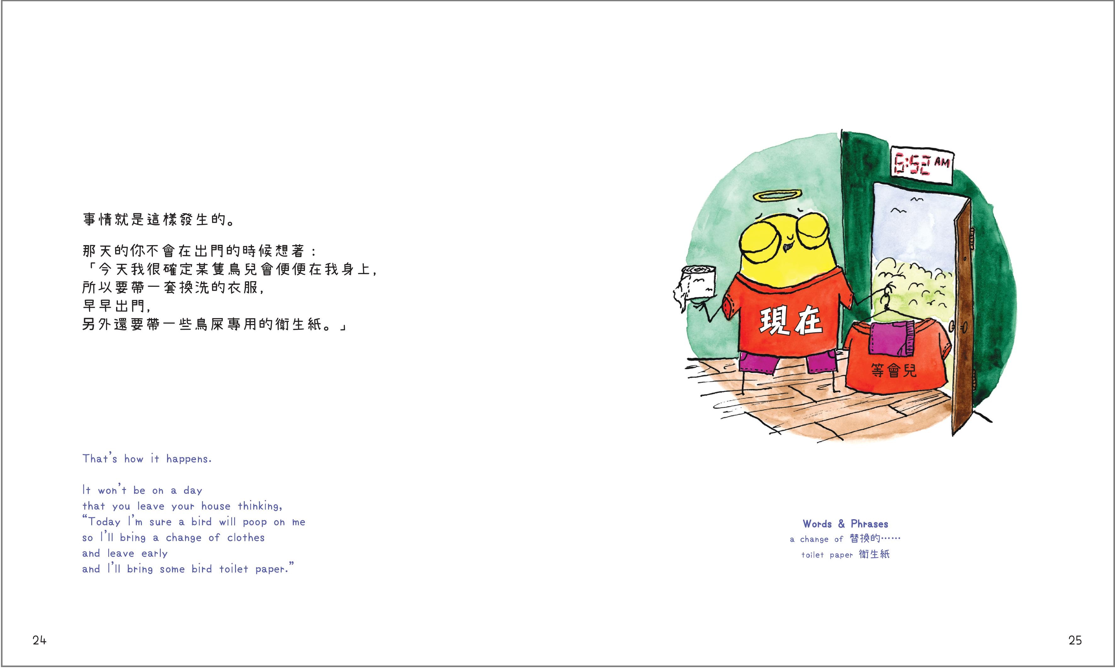 ◆「鳥兒大在身上不稀奇,稀奇的是被波及之餘還能藉此學英文,童趣插畫治癒人心,同時增加面對挫折的勇氣!身為本書推薦人之因大概是我真的曾經用頭接過鳥屎,暖烘烘之際還有點痛(鳥兒你今天便祕嗎?),恰似一股暖流流過心頭,我呸!」