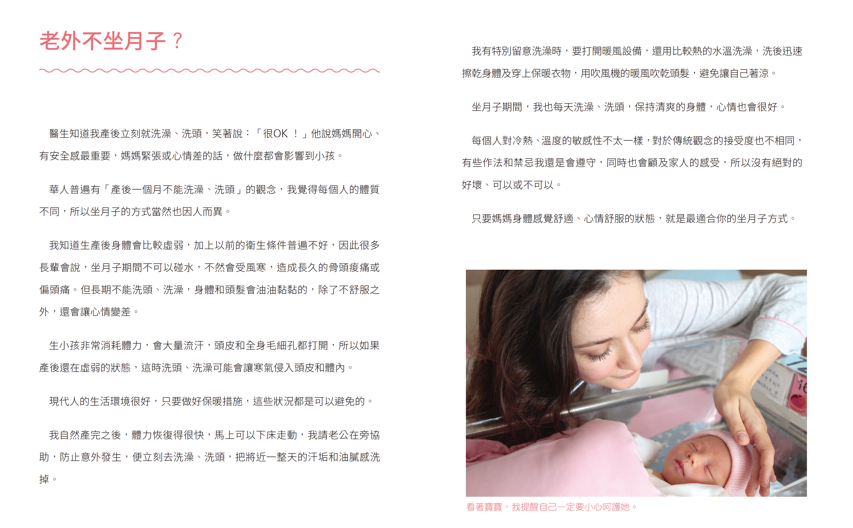 .新生兒照護:分享國外流行的「嬰兒按摩法」、為什麼「嬰兒也需要行程表」、「寶寶能出門嗎」等照護知識