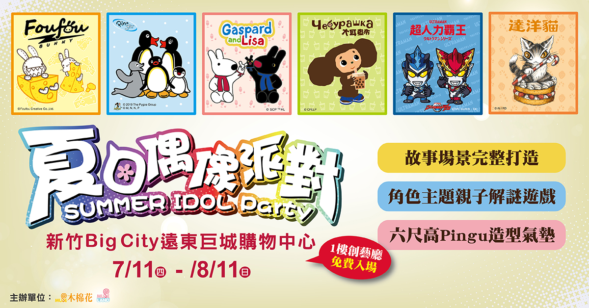 2019年暑假,不知何處去?集合目前市場上各熱門IP角色的夏日偶像派對,絕對是今年親子同樂的絕佳首選去處,台灣首站7/11(四)於新竹遠東巨城購物中心盛大開展,第二站於08/22即將移師台北新光三越南西店9F巡迴展出,結合各種IP角色的型態活動,在此齊聚一堂,期望讓台灣喜愛IP角色人物的消費者、粉絲,有機會親體驗各角色的可愛風格與多樣驚喜。本次參與的角色分別為來自法國的巴黎居民麗莎和卡斯柏、來自俄羅斯的國民吉祥物大耳查布、來自日本觀眾票選20世紀最受歡迎的繪本人物達洋貓、來自瑞士世界最知名的企鵝角色PINGU企鵝家族、來自日本擁有50年以上的真人特攝英雄超人力霸王及來自台灣知名文創品牌Foufou BUNNY。今年夏天這股從海外各地延伸至台灣的各角色超人氣吸引力,預計即將在台掀起暑期玩樂的新景點。