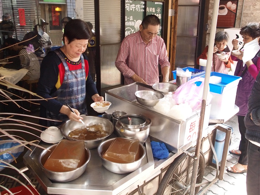 早上八點的水仙宮市場已經熱鬧到就像舉辦祭典,但是旁邊的國華街好像還在剛睡醒的樣子。走進一條小巷子叫宮後街,有一群人圍著一個遮陽傘站著。傘下一對中年夫妻站在攤子前,將愛玉及各種佐料盛到陶瓷碗,插支鐵湯匙,陸陸續續地端給客人,他們的手動迅速到就像拳術家。客人們站在路邊默默地吃。外帶的話,老闆會把全部的料放在塑膠袋裡,插一支粗吸管,是早上散步的好陪伴。