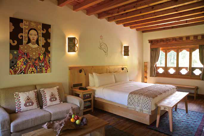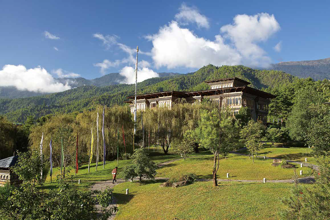 選在西不丹帔羅河谷落腳,不僅主打在世界遺產虎穴寺住一晚的特色,也承襲打造原裝正版的傳統道地建築,尋求獨一無二的定位。吉臥林旅宿請來近百位當地工匠,耗時三年六個月,在祕境中造築一方遺世絕俗的隱居天地。依照不丹的傳統建築形式「宗(Dzong)」,以當地盛產的松木與石岩為主建材,搭建出一座如堡壘般的灰瓦石牆城樓。