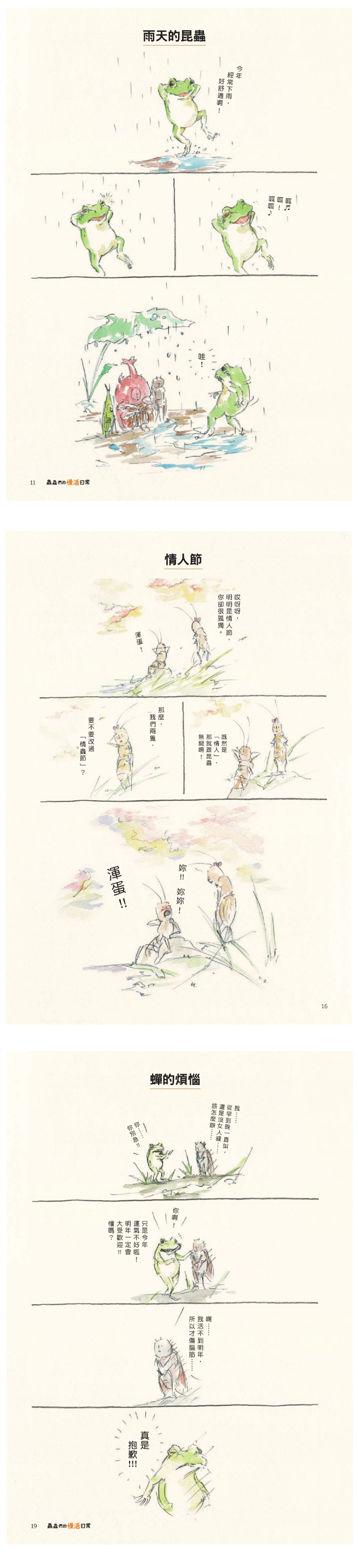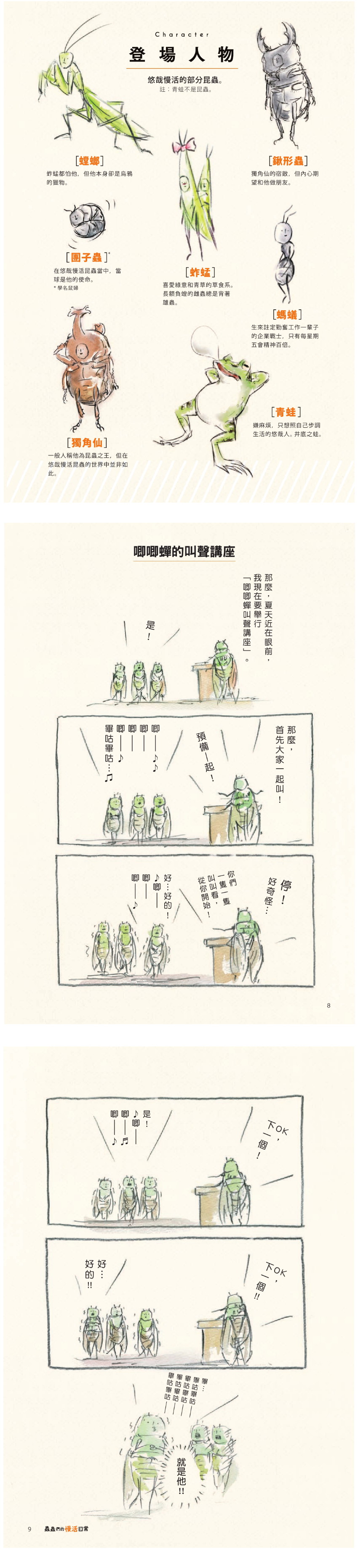 誰會想到唧唧蟬也需要上叫聲講座?長額負蝗夫婦為什麼總是形影不離、愛相隨?明明不是昆蟲卻也慢活悠哉的青蛙,又將在本書中扮演怎樣的角色?踏入呆萌蟲蟲們的世界,感受牠們的歡笑與擔憂,進而也開始關心身邊的各種小生物吧!