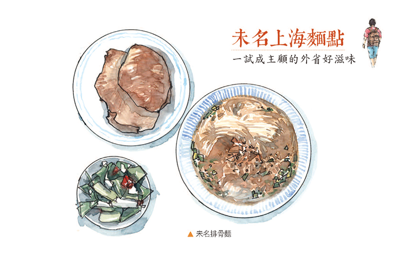 我點了一碗排骨麵,上菜時看見盤子裝著兩片排骨肉,「哇!真大器啊,難怪生意好成這樣!」