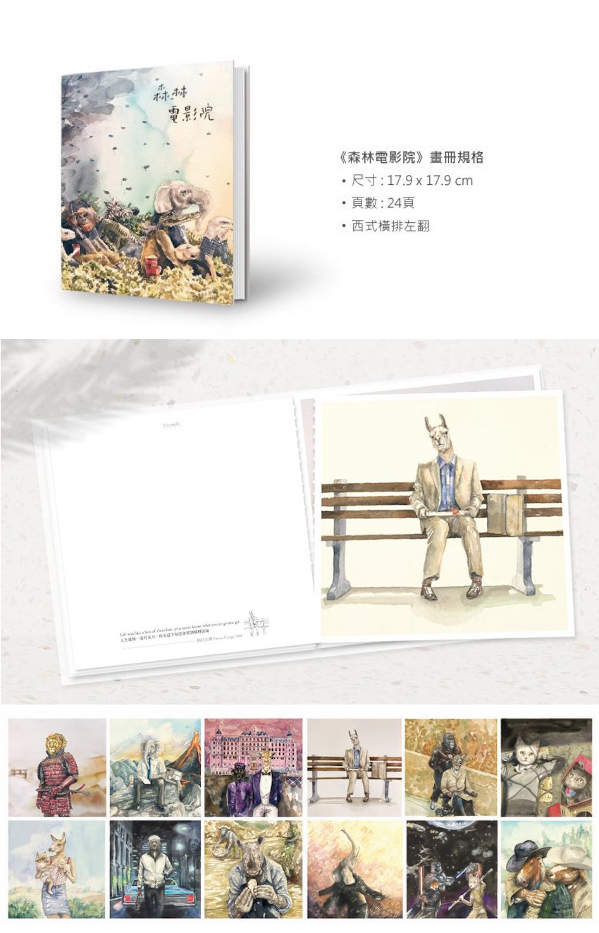 於是在這一年中,我們創作出 50 部電影與許多角色,但在即將出版之際,出版社內部發生了一些變動,我們決定終止這個合作計畫,改用群眾集資的方式,將這本《森林電影院》推出給你們,讓經典電影化身成一張張收藏、讓森林裡的動物成為你心愛的電影角色。