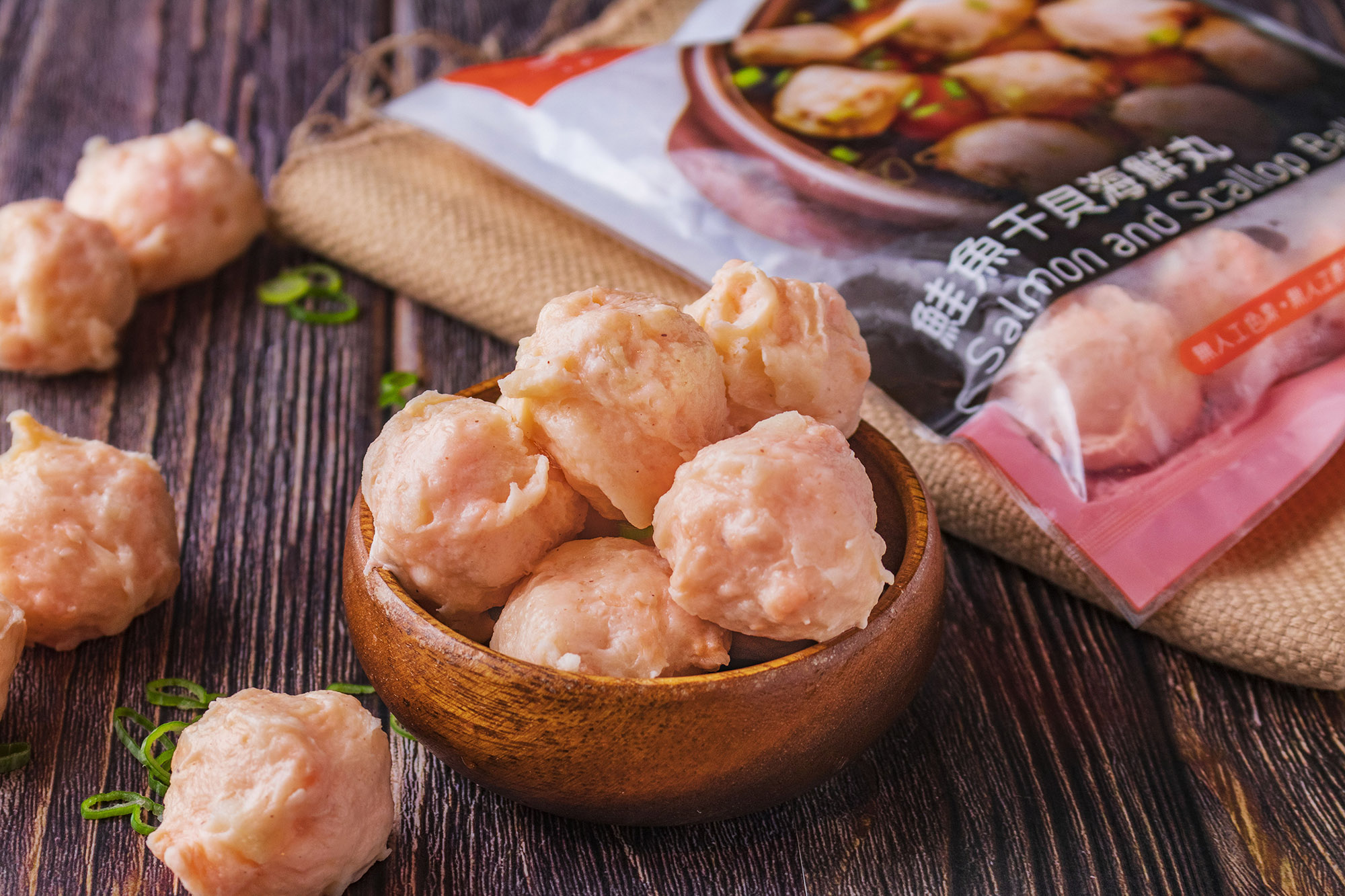 渾圓扎實、健康滿分的「美威鮭魚干貝海鮮丸」嚴選大量高品質的鮮嫩鮭魚,拌入生鮮干貝、魚漿、魷魚、荸薺增添口感層次,堅持以最天然的工法呈現鮭魚的美味菁華,因此不額外添加色素、香料、防腐劑、味精等人工添加物,一口咬下,滿是油潤鮮腴、鮮嫩多汁的鮭魚,同時加入頂級干貝,細品來自大海的濃郁鮮美,佐魷魚、荸薺入餡,讓口感更加Q彈順口、唇齒留香,在簡約便利的包裝下,將成本著重於高檔食材,期望以健康、優質的五星美味,成為消費者送禮、自用兩相宜的品味之選!