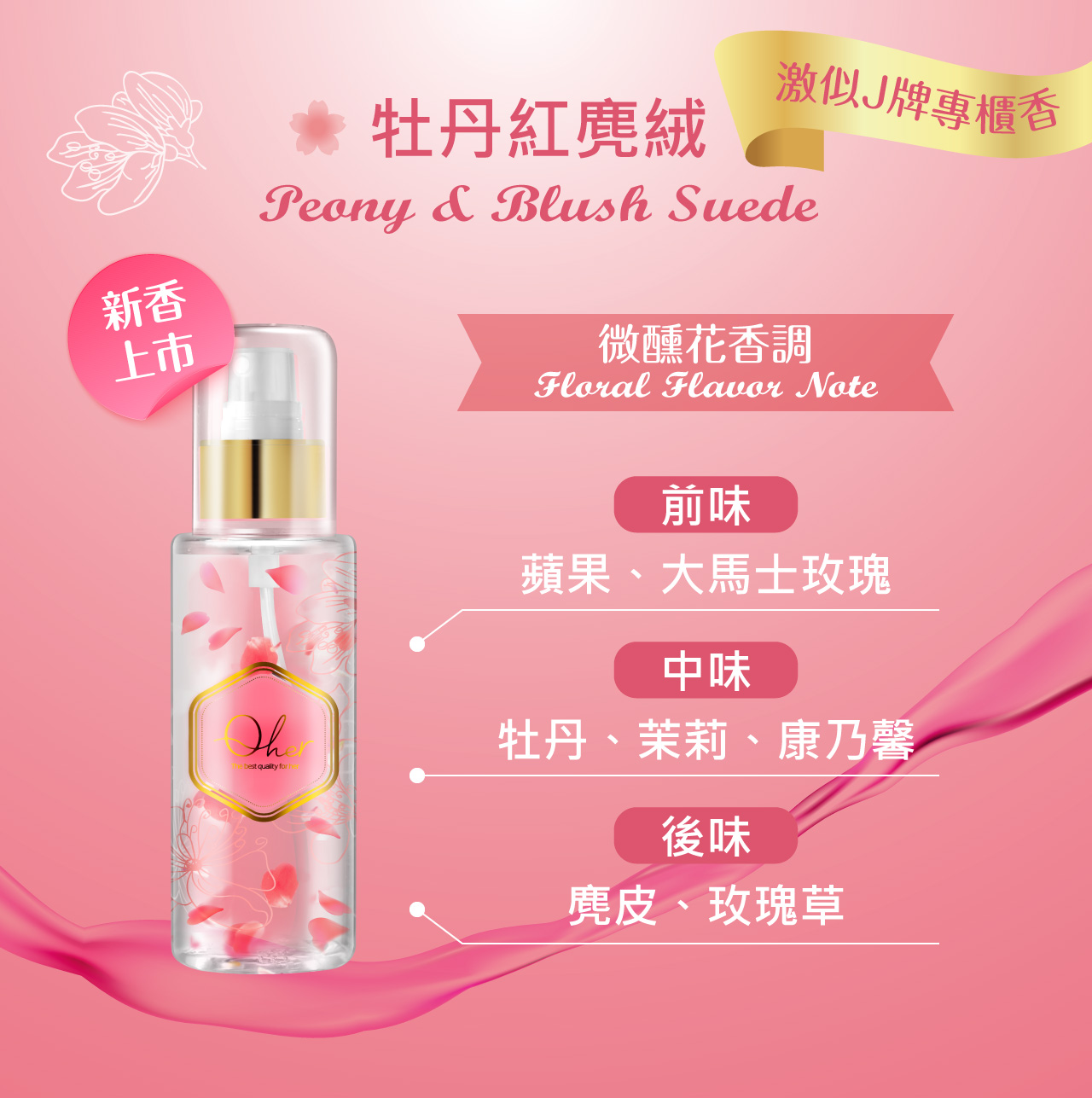特別介紹冬季獨家上市款牡丹紅麂絨,搭配的是超美紅色花瓣,11月才剛上架的香味,前中後味分別含有玫瑰、牡丹、康乃馨,激似專櫃的香水味道讓人心動,香氛除了可以用來當髮香水外,也可以消除環境的異味,讓你隨時都飄著香香的味道,牡丹款限量推出要買要快。