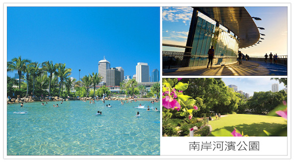 【南岸公園】為1988年世界博覽會的舊址,位於布理斯班河南岸,占地16公頃,是最受市民喜歡的地點,而北岸正是大廈林立的市中心,市民會在假日時觀看廣場上街頭的表演,是享受亞熱帶氣候的好去處,也是每年各式慶典活動中心,觀看跨年煙火之地!南岸公園亦是昆士蘭美術館,圖書館及博物館的所在地。
