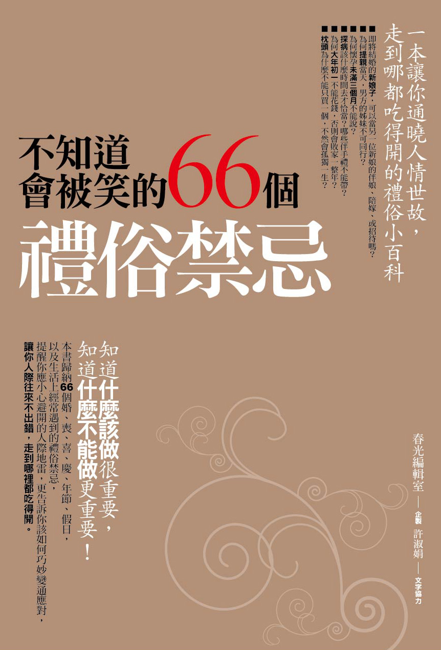 本書歸納66個婚、喪、喜、慶、年節、假日,以及生活上經常遇到的禮俗禁忌,