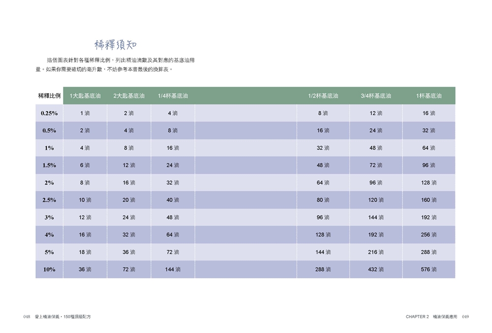 本書收錄10款熱門的複方精油,如幫助消化、呼吸順暢、鎮定、排毒、內在平靜、心情愉悅、澄心、安眠、快速止痛、盜賊配方等,你也能試著自己調配出專屬保養品。
