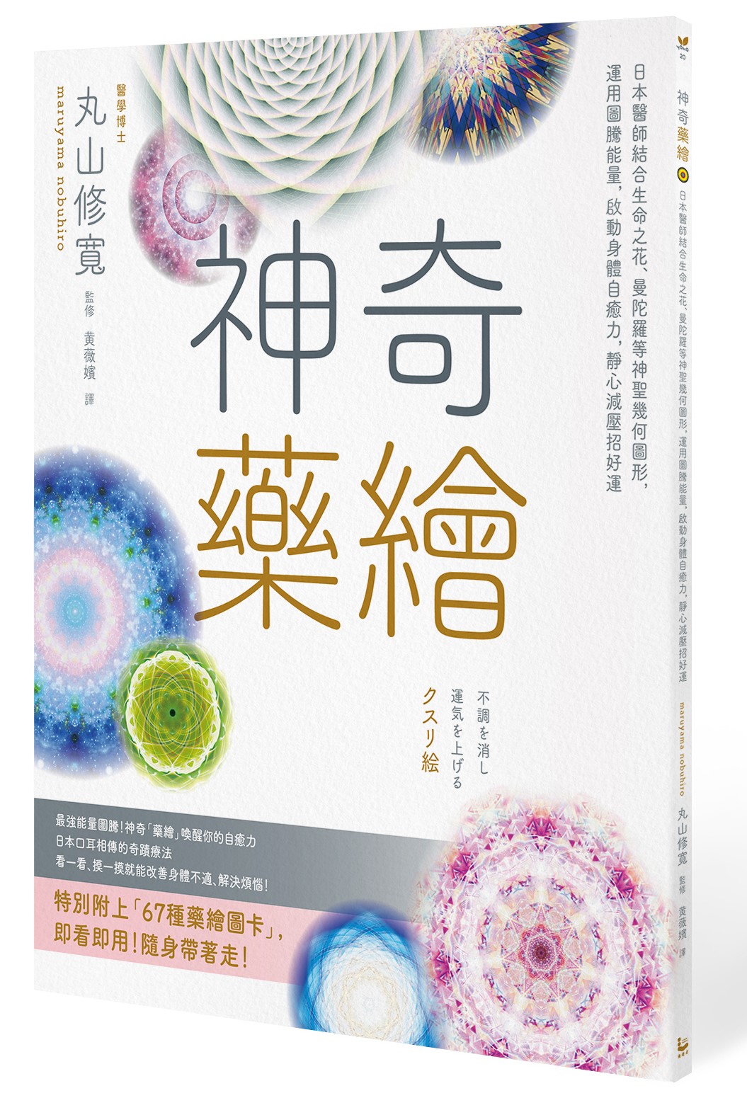 由日本醫學博士丸山修寬經過多年研究並開發的「藥繪」,不只是美麗的藝術也具有神奇的能量,融合東方醫學與西方科學,結合了數學、物理學、神聖幾何學和古代符碼與古文字的概念,包含了印度的曼陀羅、中國的太極、西方的十字架或是生命之樹,以及東西方都可見的生命之花,最適合調節生命能量、改善周遭氣場,提升人類的自癒力並發揮潛能,超過80%患者使用後有感!