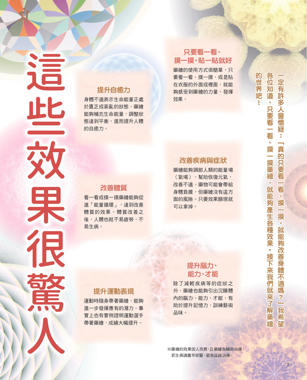 使用「藥繪」,沒有藥物的副作用,不需要昂貴的花費,也不用複雜的儀式,只要看一看、摸一摸、貼一貼,初學者一下就能上手。方便個人使用外,還能贈送給想關心、想祝福、想改善彼此關係的對象,讓身邊的人也能有奇妙的轉變!