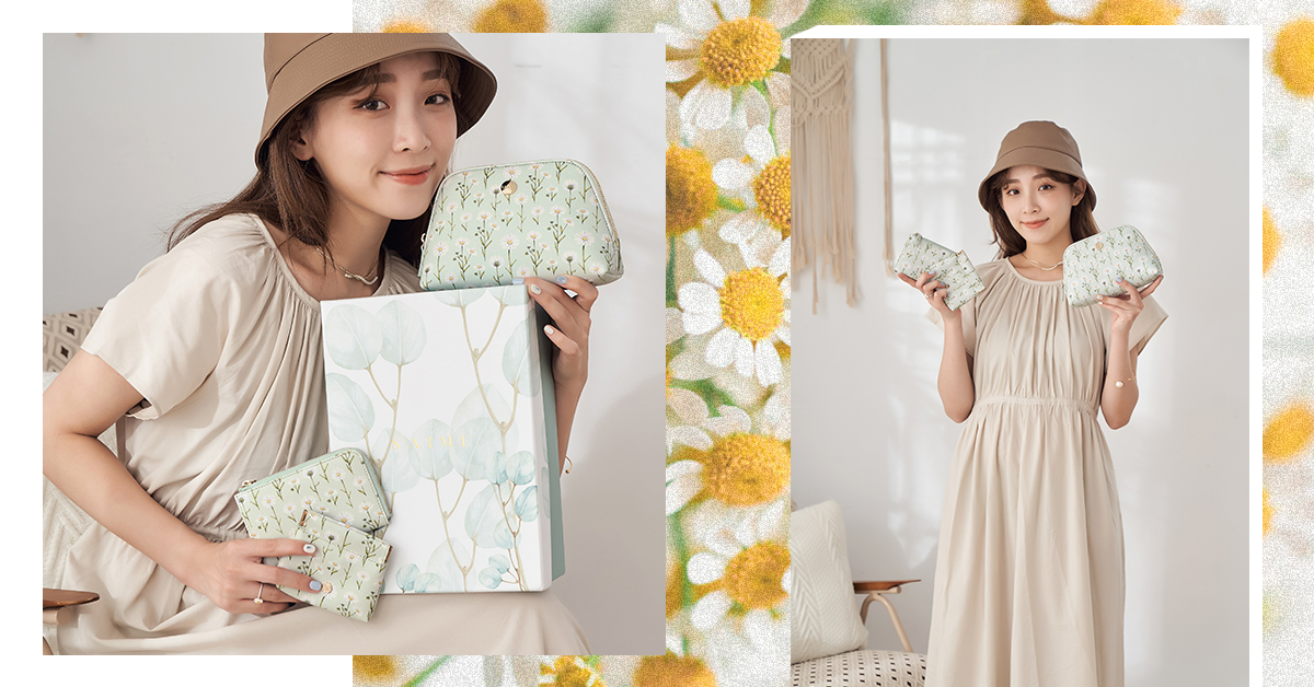 S’AIME東京企劃推出的「小雛菊旅行組禮盒」,像是帶著夏末涼風吹拂的青草香,除了可以容納女孩各式彩妝、刷具的化妝包,同款清新小雛菊色系卡片零錢夾,有效降低旅行時還要攜帶長夾的不便,同時減輕肩膀行李的重量;彈片迷你收納袋,收納軟膏、隨身藥品,讓背包打開時一目了然,清爽又整齊,就是單身旅行想要的感覺!