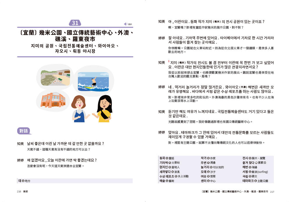 本書包含11種台灣美食、11個台灣縣市,以33篇對話組成,對話除了基本介紹外,還能站在韓國人的立場來交談。舉例來說,台灣電影《不能說的秘密》在韓國非常有名,介紹淡水時當然就不能不提!談到蚵仔煎時,也能聊聊韓國煎餅與蚵仔煎的差別,增加聊天話題。另外,對話人物設定為台灣人與韓國人,可以模仿句子直接運用,用韓語聊台灣!