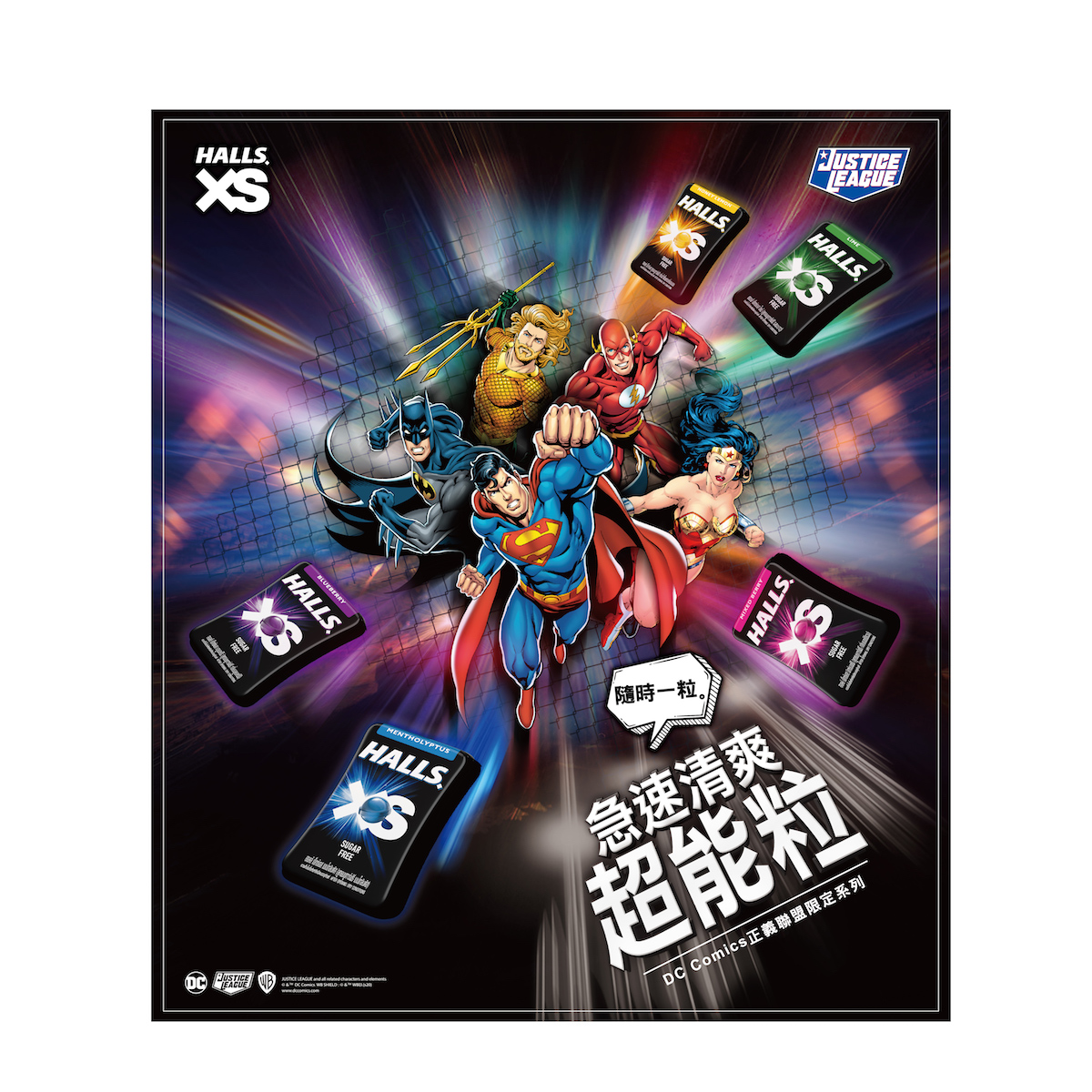 釋放你的酷涼超能粒!HALLS XS無糖迷你薄荷糖,重磅推出《正義聯盟》全系列限定包裝!本次與正義聯盟攜手合作,五種口味搭配5個英雄形象,帶給你如英雄般的超能力,預期引爆正義聯盟迷的蒐集熱潮!透過HALLS XS薄荷糖的酷涼,帶給消費者最即刻的急速清爽超能粒!