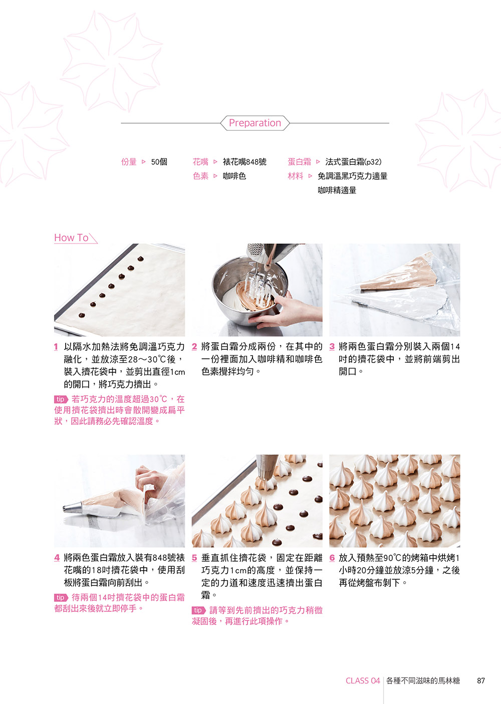 準備與基礎單元▶▶介紹不同口感的法式、瑞士、義式3種蛋白霜製作方法,及失敗原因與改善方法。