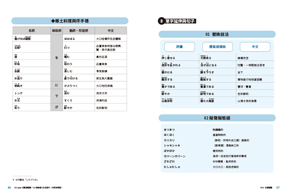擬聲擬態語──擬聲擬態語是日語表現中相當重要的一環,卻也是學習者最不熟悉的項目之一。例如,眼睛有異物感(「目がチカチカす」)、反胃(「胃がムカムカする」)等,這種最貼近生活情境的表現,卻是一般教科書欠缺的。