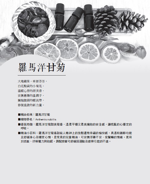■精油小百科:羅馬洋甘菊香甜給人精神上的放鬆還有幸福的愉快感,具溫和鎮靜功能 且舒緩身心及穩定心情,是常見的兒童精油,可安撫浮躁不安、受驚嚇的情緒。更用 於抗敏、抒解壓力與助眠。調配按摩可舒緩因運動及疲勞引起的不適。
