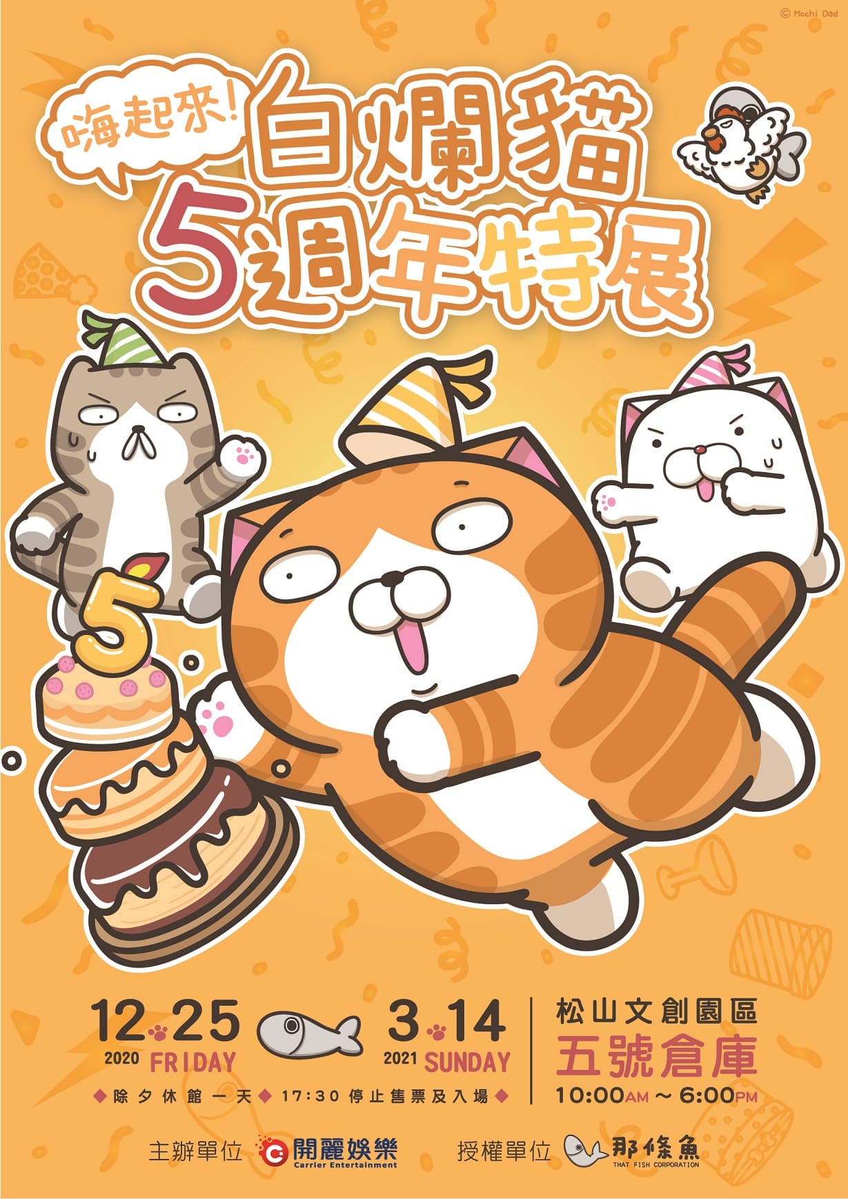 全體注意!還記得第一次的「白爛貓超有事特展」風潮盛況嗎?這次爛爛五歲啦!延續居高不下的人氣,即將與他的夥伴們一同開趴!!「嗨起來!白爛貓五週年特展」,不僅更好玩、更豐富、而且超白爛。千呼萬喚白爛貓五週年特展12/25將於松山文創園區五號倉庫盛大開幕,完整呈現白爛貓五年來所有的耀眼時刻。