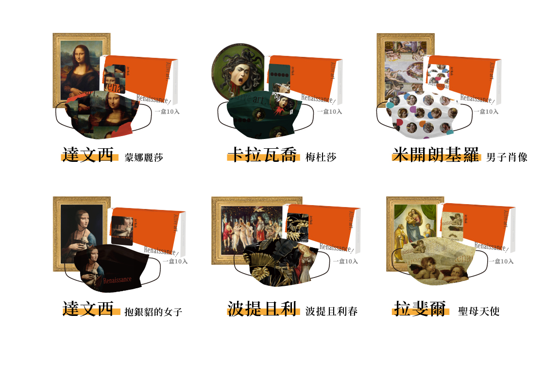 展覽周邊商品包含:義大利百年皇家酒莊紅酒、藝術名畫晴雨兩用傘、經典畫作明信片(精裝套組/10款單張)、藝術口罩防護你、創世紀經典潮T、蒙娜麗莎圍裙…等,7月15日於翡冷翠文創官方網站、博客來、Ibon、統一Open Point、….搶先開賣