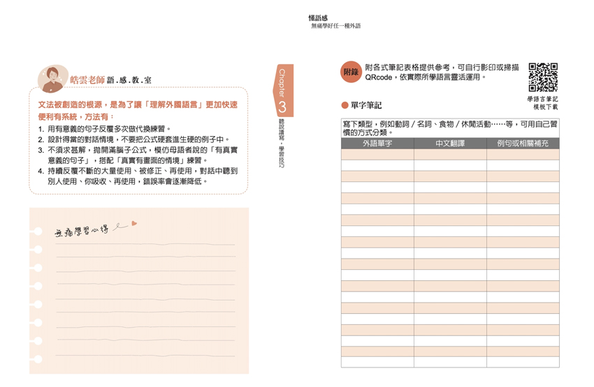 單字筆記、句型筆記、動詞變化筆記、「每週天天三個十分鐘」學習筆記與「輸出輸入」學習計畫表單,含QRcode,讀者可自行複印或下載運用。