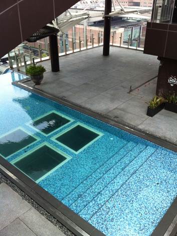10F泳池正下方玻璃可透視9F Myst Club,讓在城市中心游泳成為一種時尚趣味。