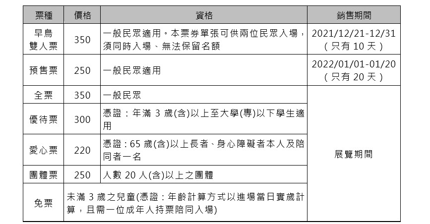 4.其他票務規定或因本票券致生之任何消費爭議,依文化部頒訂之藝文展覽票券定型化契約應記載及不得記載事項辦理。相關異動訊息與票務事項,如因故異動展期或公休,恕不另行通知。
