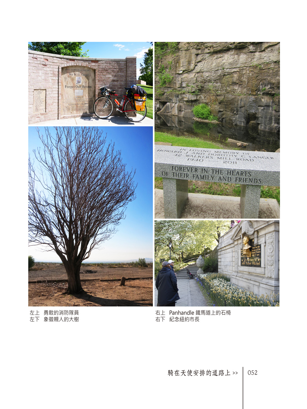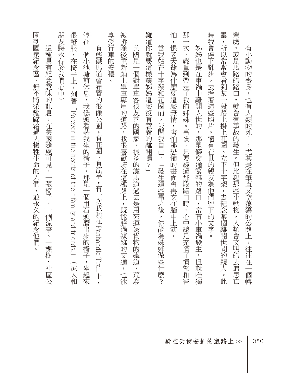 有一天,我看到一個石椅的椅背上刻著,「這張椅子是為了紀念某人而設立的」,經過某段公路,某個涼亭,某個小花園,都有著為了紀念某些人而存在的標語。我漸漸瞭解到,這趟旅程,原來是母親和姊姊留給我的最後禮物,也是陪著我成長的最後一段路。