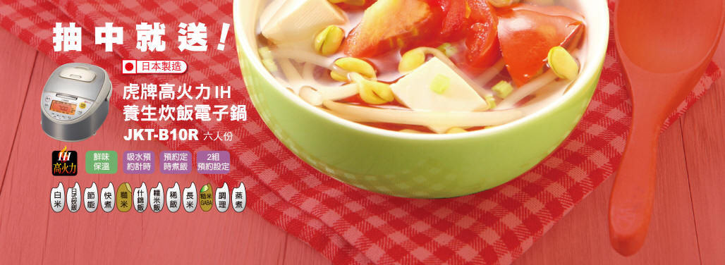 抽獎方式:以隨機抽取的方式,在2015/01/27 抽出第一位幸運兒,將於一周內通知得獎人,並寄送虎牌JKT-B10R 電子鍋乙台