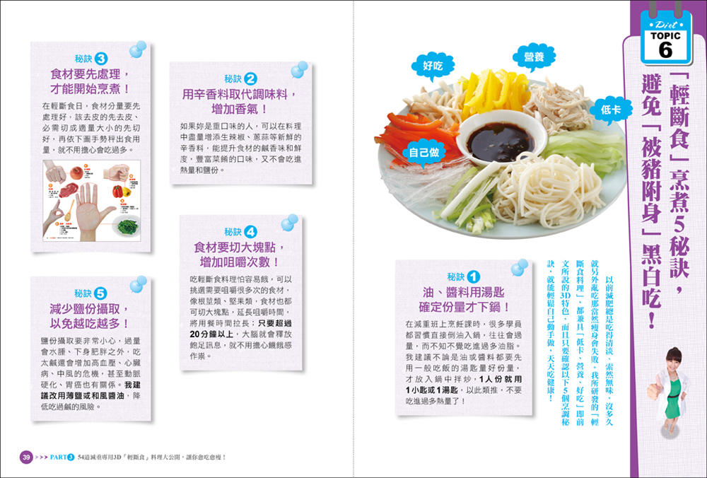 別以為減肥只能「吃草」!──減重班學員實證,就算想要變瘦,也能放心吃飯麵、火鍋、滷菜……,這些台灣人最愛吃的好料都能端上桌,通通沒問題!──營養師親自調配48道台灣味鹹食+6道低卡甜點,選擇多元,口味豐富,讓妳不需忌口,想吃就吃!更棒的是,「輕斷食料理」只需要簡單烹調,沒有油煙,不僅5分鐘輕鬆就能上菜,還能讓妳不吃到黑心餿水油!