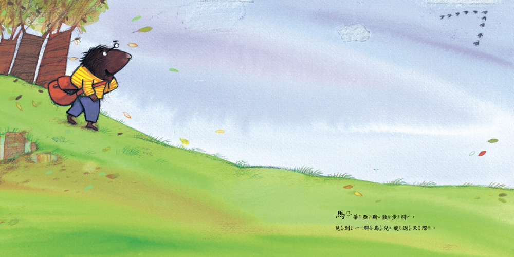 馬蒂亞斯散步時,見到一群鳥兒飛過天際。他覺得這畫面好漂亮,於是決定把它畫下來。畫完後,馬蒂亞斯覺得這幅畫真好看,應該把它展示出來……