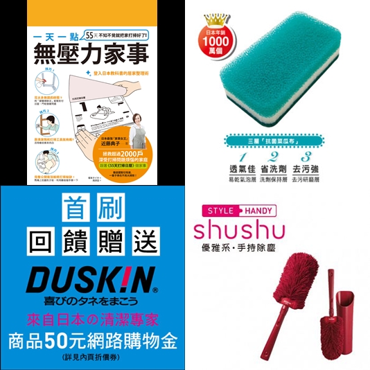 《一天一點無壓力家事》於12月30日起各大書店通路熱賣中,在博客來購買本書還贈限量「日本DUSKIN抗菌菜瓜布」及購物金。
