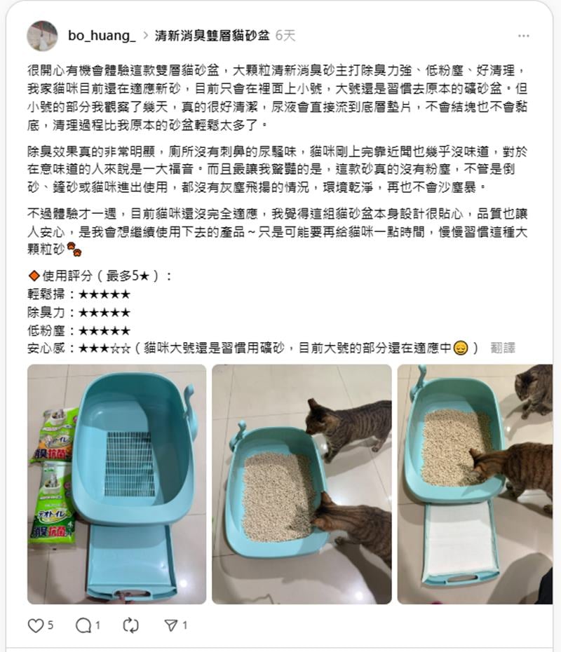 最近參加了「清新消臭雙層貓砂盆」的免費試用體驗活動,使用了一段時間,真的覺得這款砂盆非常實用,想跟大家分享一下心得。 首先最有感的就是清潔真的變輕鬆很多。以前總是要處理結塊的貓尿,還常常會有黏底的情況,很麻煩。這款貓砂盆完全沒有這種困擾,沒...
