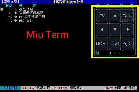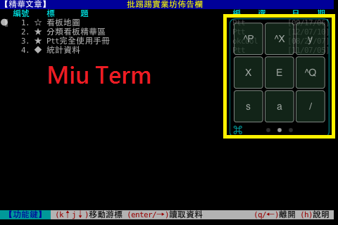 Miu Term快捷功能鍵有三頁之多,除了閱讀文章之外,連推文/發表文章都可用快捷鍵來輔助,甚至是搜尋文章的”/”也都有喔!更讚的是,使用者可以自己添加快捷鍵功能,創造一個最perfect的功能鍵。