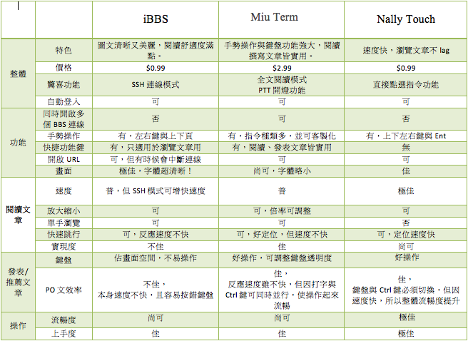 整體評論下來,似乎Miu Term以多樣化的功能鍵勝過其他兩家BBS軟體,但是iBBS與Nally Touch也各有自己的優勢,建議使用者依自己操作上的需求與習慣,選擇最適合自己的一款軟體。
