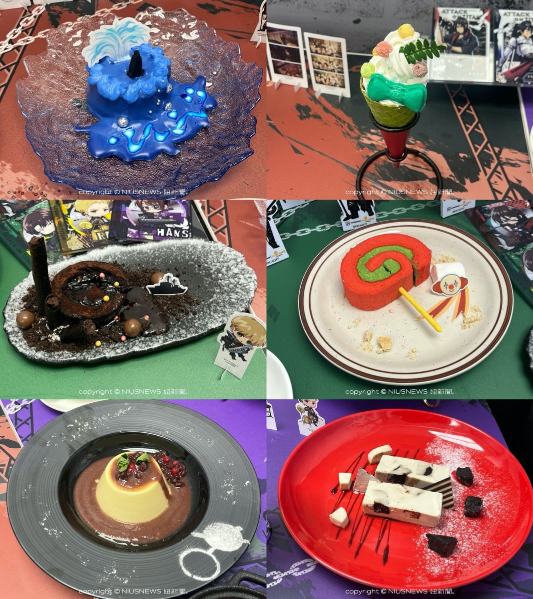 螞蟻人必吃的甜點,也有6款可以選擇。包含「艾連的座標樹蛋糕」、「米卡莎的初次品嚐甜筒」、「阿爾敏的熔岩蛋糕」、「里維的紅絲絨抹茶瑞士卷」、「漢吉的紅豆布丁」、「萊納的雙重巧可力椰奶凍」等,每道顏值都超高!