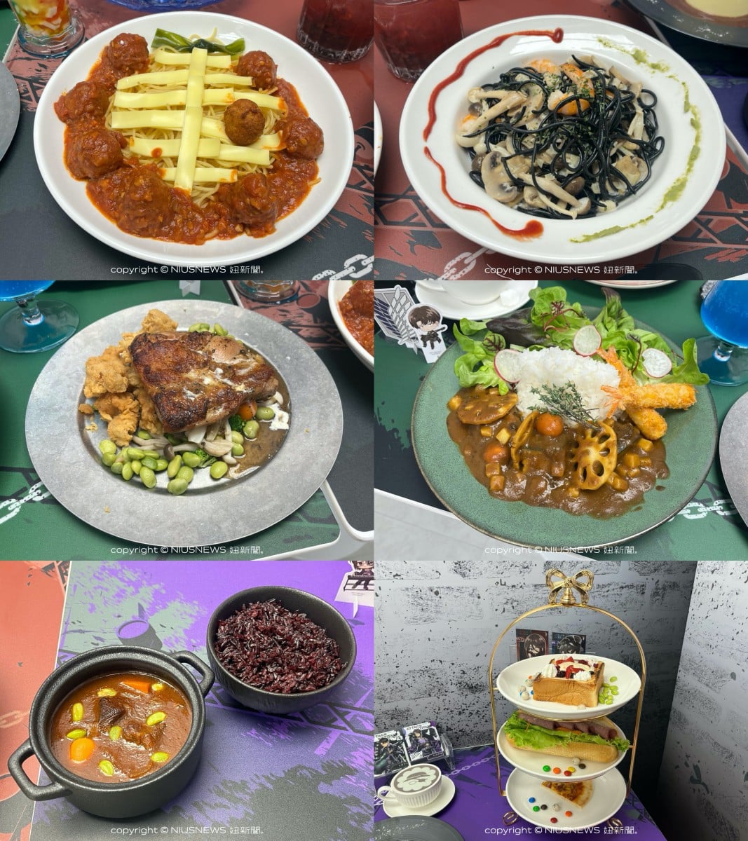 本次聯名餐廳共推出6款主餐,集結「艾連的起司肉醬大利麵」「米卡莎的海鮮蘑菇墨魚麵」、「阿爾敏的調查兵團特供餐」、「里維的立體機動咖哩」、「漢吉的燉鍋」、「讓萊納錢包空空」等,還原動畫裡的經典元素!