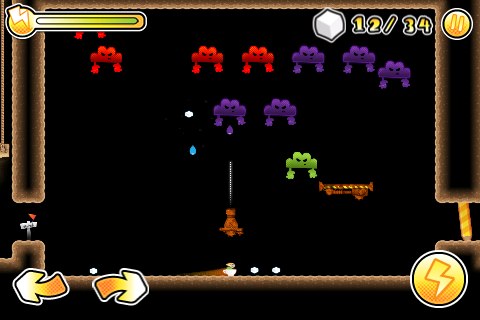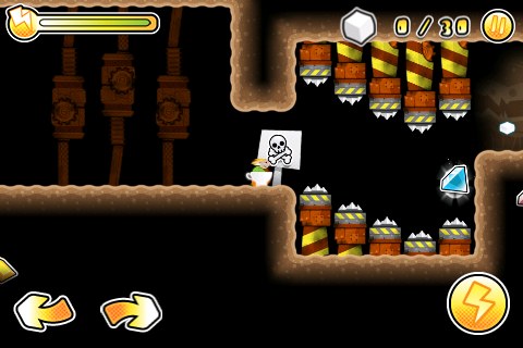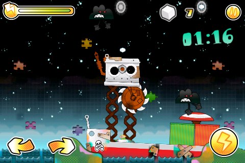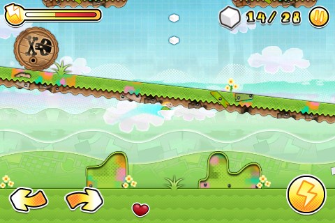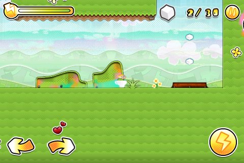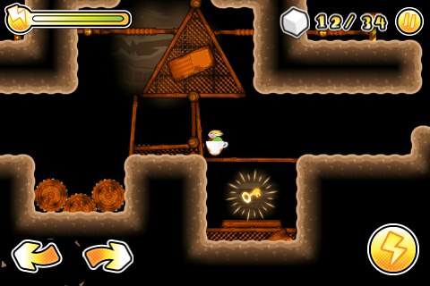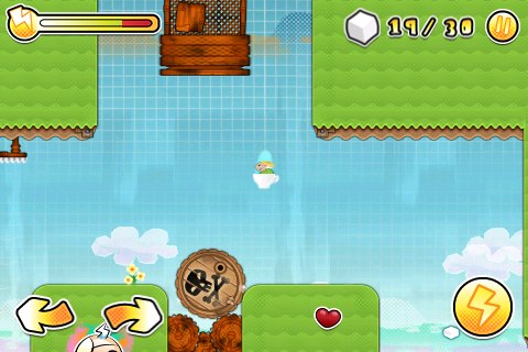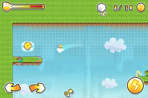 先從單純到不行的操作看起吧。說來就是左右移動與上下飄飛兩項而已,按左下角的方向鍵來前進後退,搭配右下角的閃電起飛降落。但好康不是天天有,左上角的閃電能量棒標示了茶杯剩餘的飛行動力,乾了就會掉下來噢!這時候只要放開右下角的閃電按鈕就可以利用天地精華迅速補滿啦!