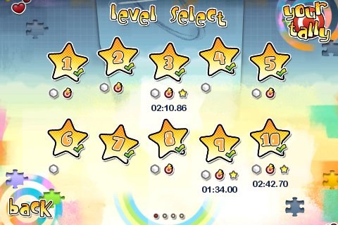 玩累了當然也可以翻翻關卡選單,不但詳細記載了已經取得的各項成就,得到星星的關卡還會紀錄完成時間,方便玩家自我挑戰!