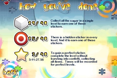 總結來說Storm in the Teacup就包含了這三項目標,並在完成關卡時分別可得到三樣成就:找到關卡中的隱藏貼紙就會得到紅色的箭靶圖案,蒐集到所有的方糖會在抵達終點後再得到一塊方糖(咦?),如果在特定時間內完成關卡,並取得所有的貼紙與方糖,且沒有化成碎片就抵達終點的話就是完美過關,可以獲得一顆星星!