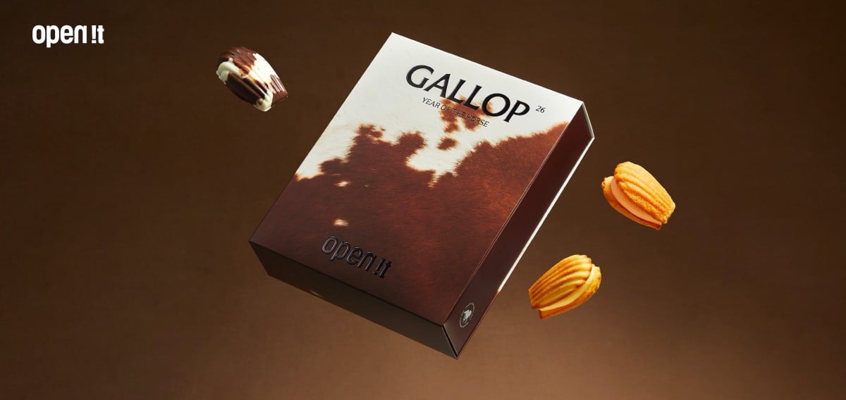 open it. 以象徵自由奔放的「Gallop 馳騁」全新創作,推出混搭大人系奢華口感與果香系清爽尾韻的九款瑪德蓮新品,不僅獨家設計馬毛紋手繪造型,還有松露、明太子、國宴級果醬等精奢食材入料。此外,加碼聯名的「有貴人」水果乾禮盒,更是不容錯過。