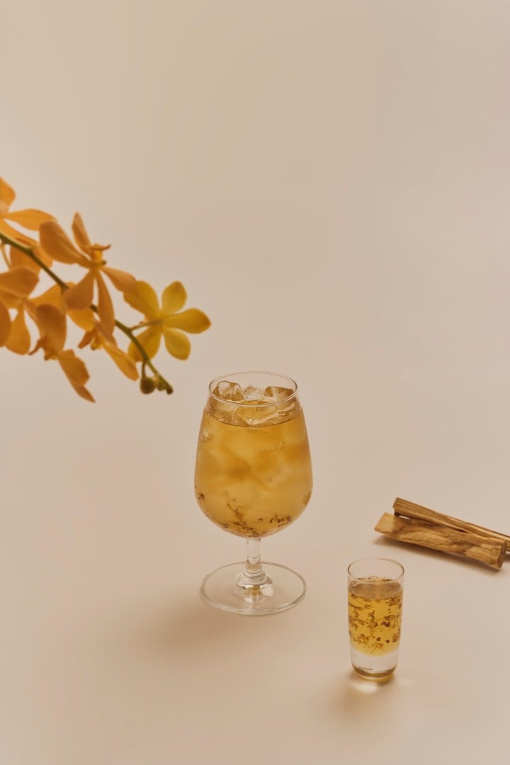 「春吉桂花粉粿」以春吉的四季春為基底,融合桂花蜜與金黃晶透的桂花粉粿,層層綻放梔子花、玉蘭花、野薑花的清雅香氣,搭配桂花粉粿更能帶出純茶的富足香氣。