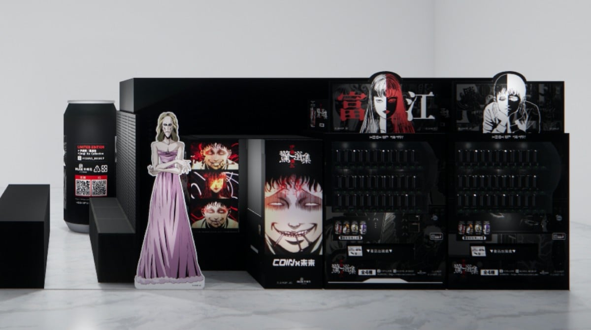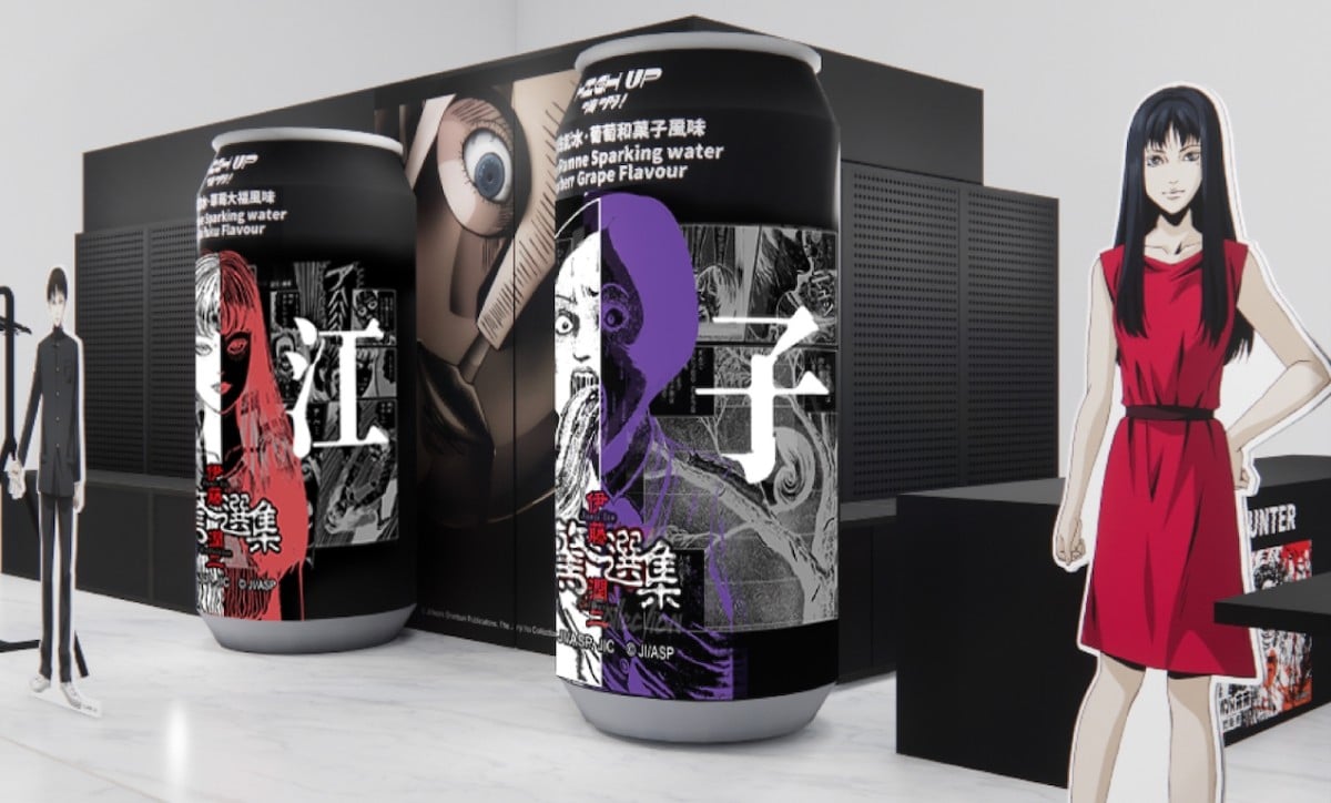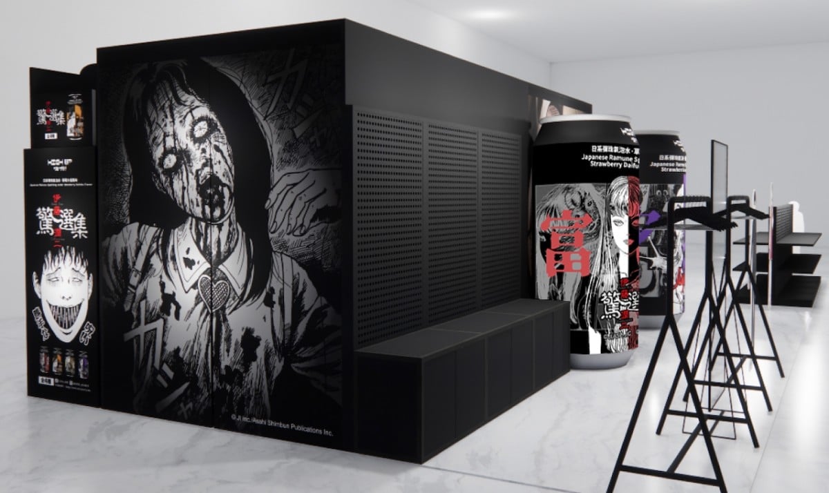 入口處特別擺設「聯名罐裝飲品充氣裝置」等著大家拍照錄影。黑底剪影搭配大膽跳色,將富江、雙一、夕子與淵的詭譎給封印其中,實在太震撼!
